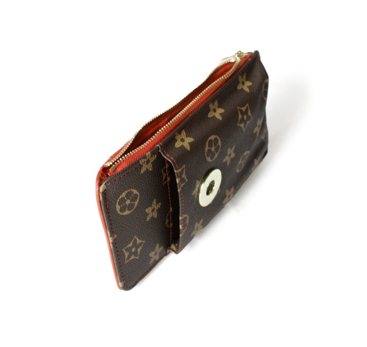 Incluye compartimentos frontales para tarjetas y un bolsillo principal con cierre metálico resistente, ideal para guardar billetes, monedas, documentos o llaves.