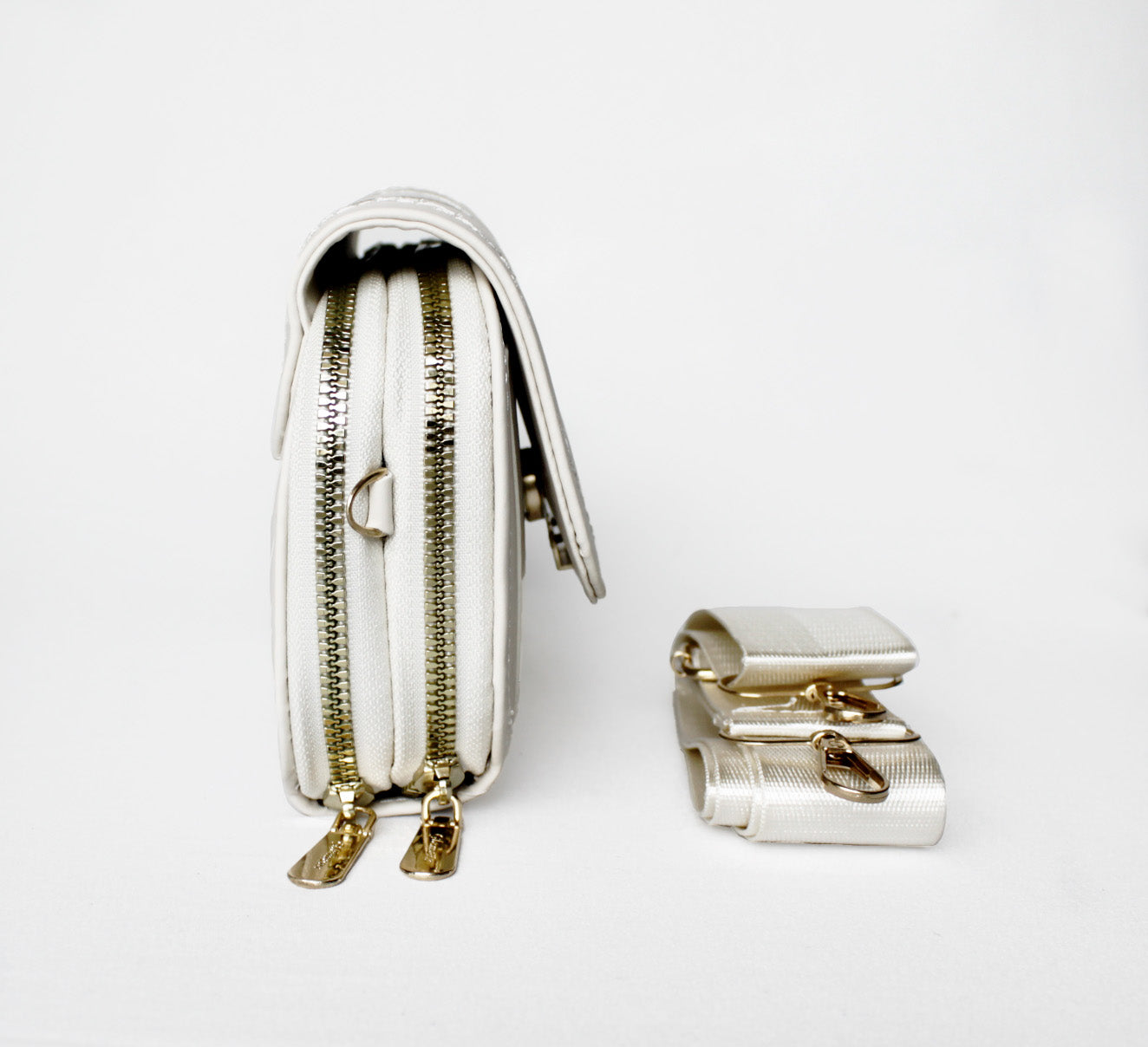 Manos libres compacto y elegante, perfecto para llevar lo esencial con comodidad y estilo. Fabricado en material sintético de alta calidad con acabado metálico suave y diseño acolchado tipo “matelassé”, que le da un toque moderno y sofisticado.
