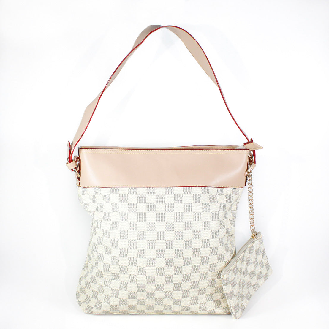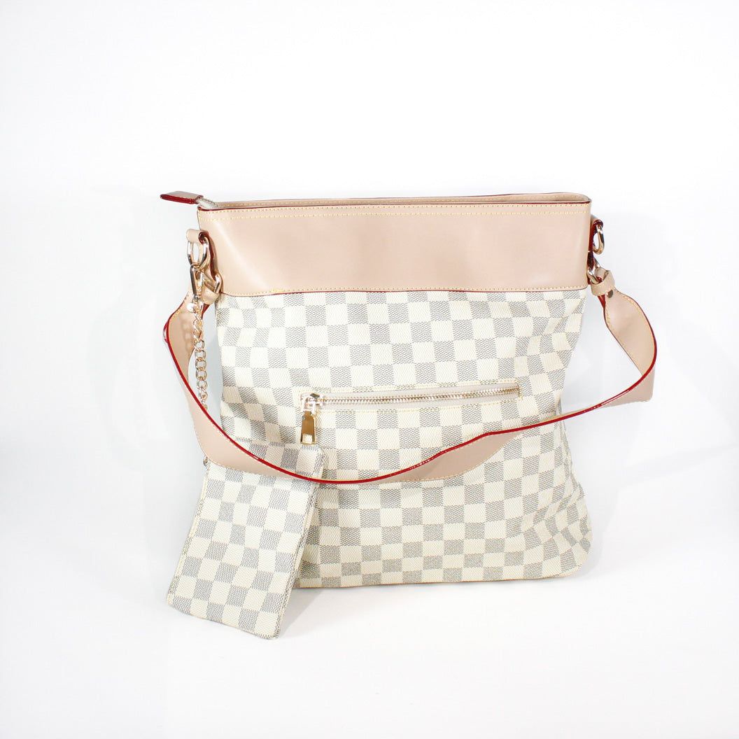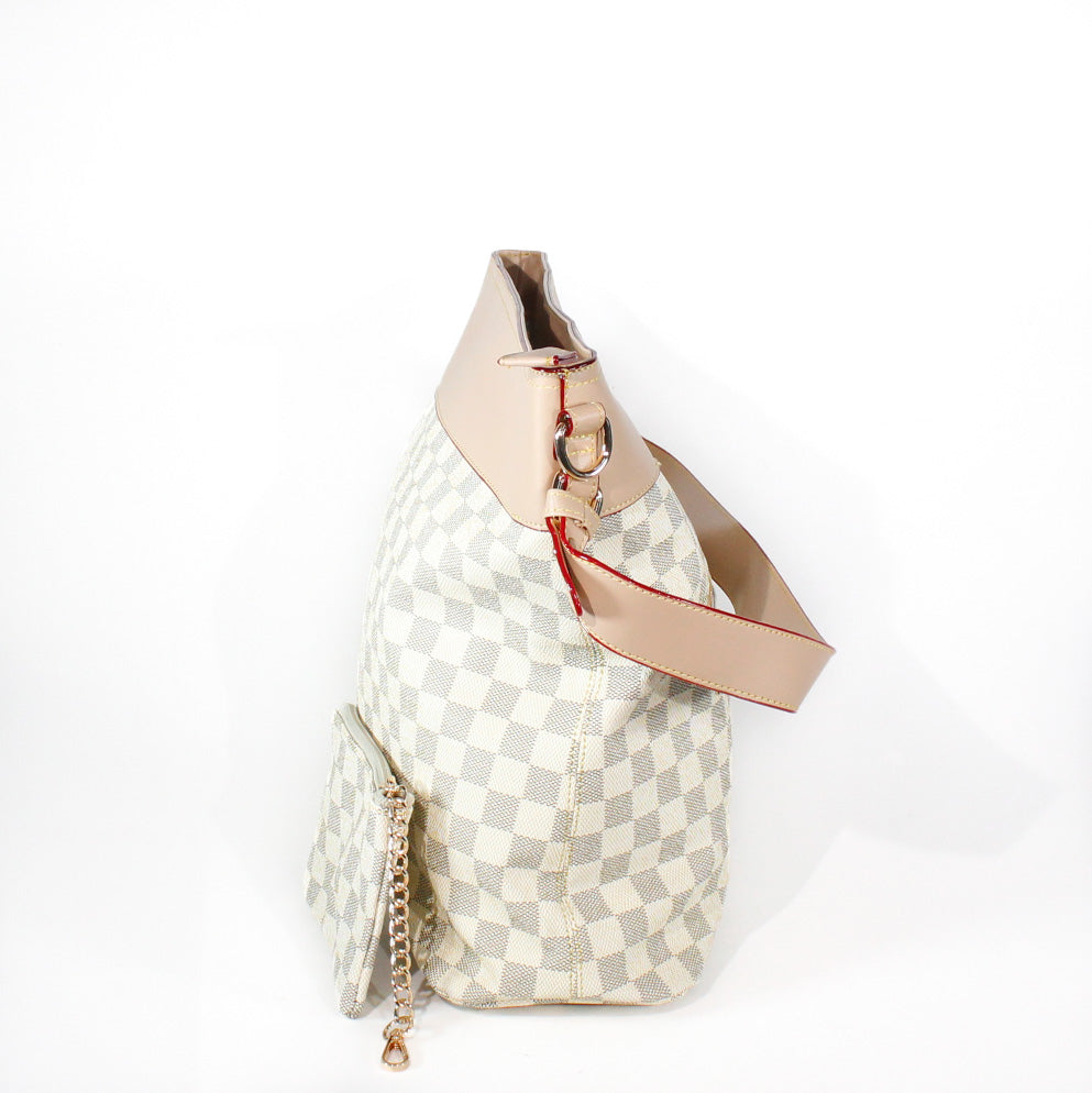 El "Atenea" es un bolso de hombro diseñado para mujeres que buscan destacar con elegancia y seguridad. Su estampado a cuadros sobre fondo beis le da un aire sofisticado con toques clásicos, ideal para elevar cualquier look diario.